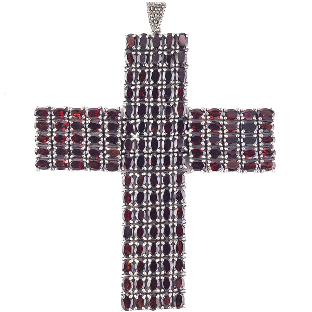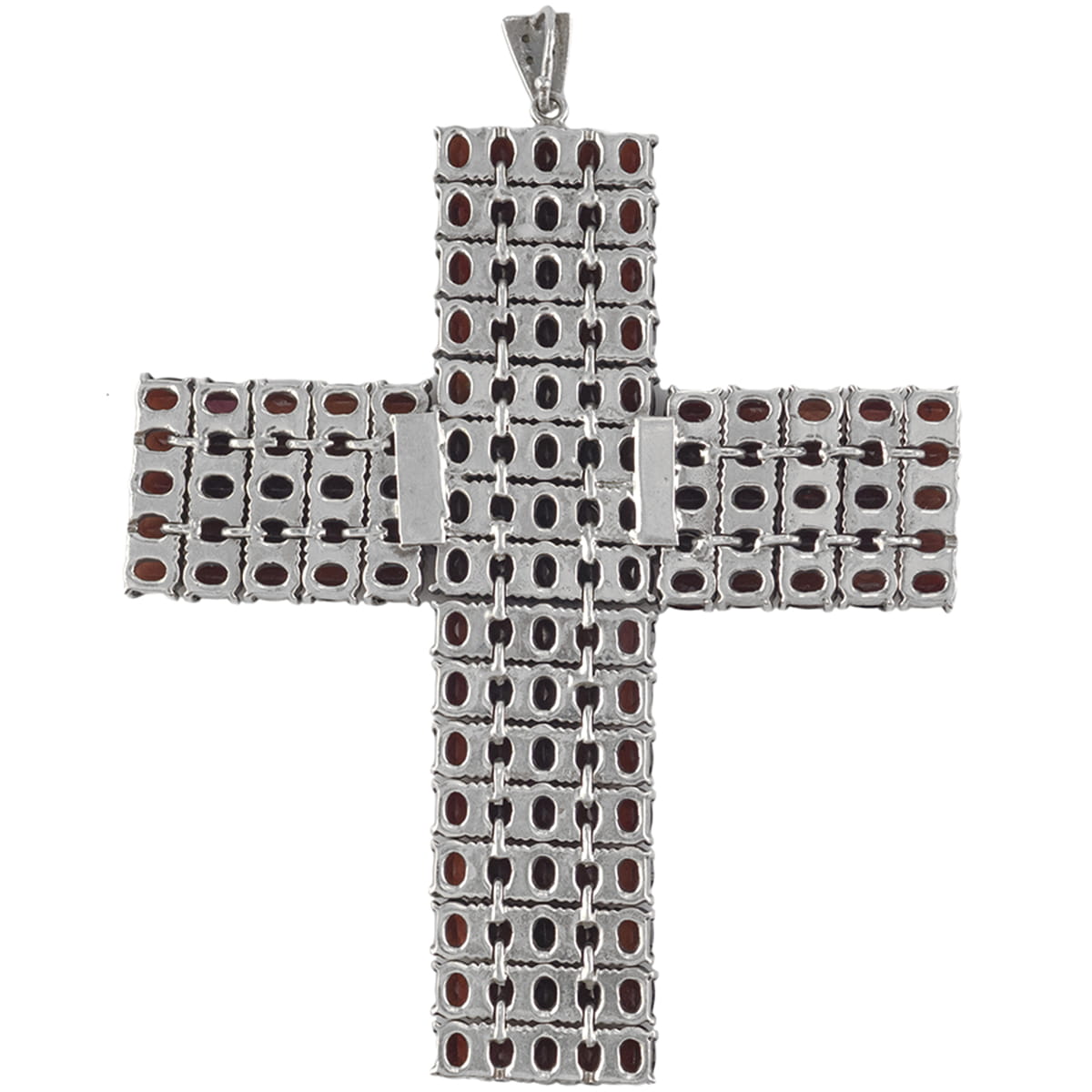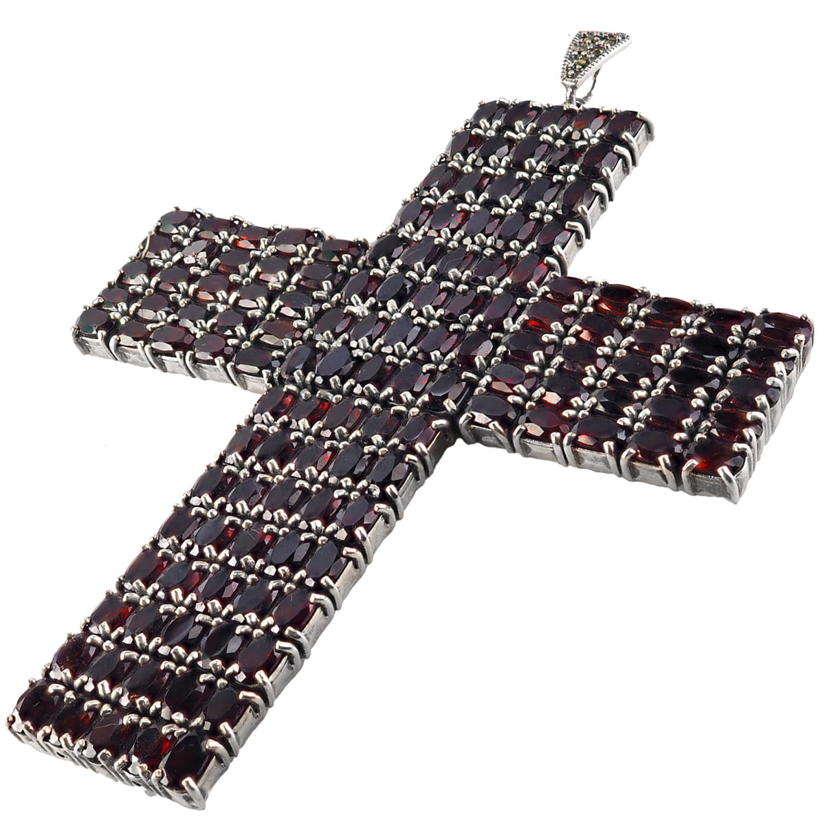 Oryginalny, duży wisior - krzyż wysadzany zakuwanymi naturalnymi granatami (130 kamieni!), wykonany ze srebra próby 0,925. Zawieszka wisiora ozdobiona jest markazytami.